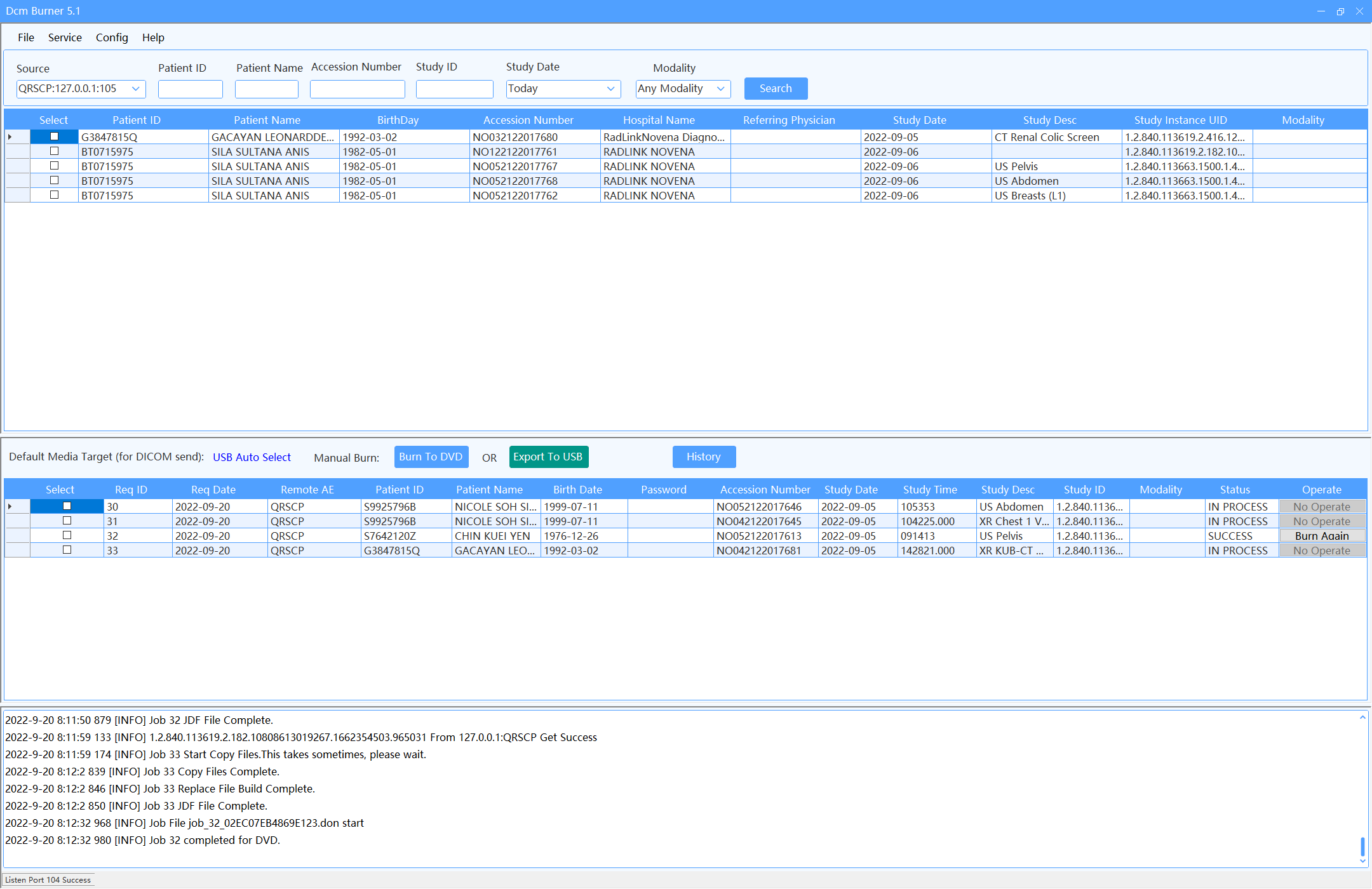 DcmBurner heeft een intuïtieve Dicom CD Brander interface. Zoek patiëntendossiers en klik op 'Branden naar DVD' of 'Exporteren naar USB'. DcmBurner ondersteunt ook automatisch branden door DICOM data naar AE title te sturen.